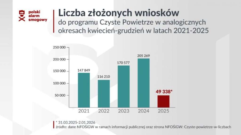 Dane dotyczące liczby składanych wniosków pokazują wyraźny spadek zainteresowania programem po wprowadzeniu nowych zasad. Od końca marca do grudnia 2025 r. złożono niespełna 50 tys. wniosków, podczas gdy w analogicznym okresie poprzedniego roku było ich ponad 205 tys. Polski Alarm Smogowy zwraca uwagę, że przy obecnym tempie realizacji osiągnięcie celu programu, jakim jest wymiana źródeł ciepła i termomodernizacja 2,5 mln domów do 2032 r., może być zagrożone.