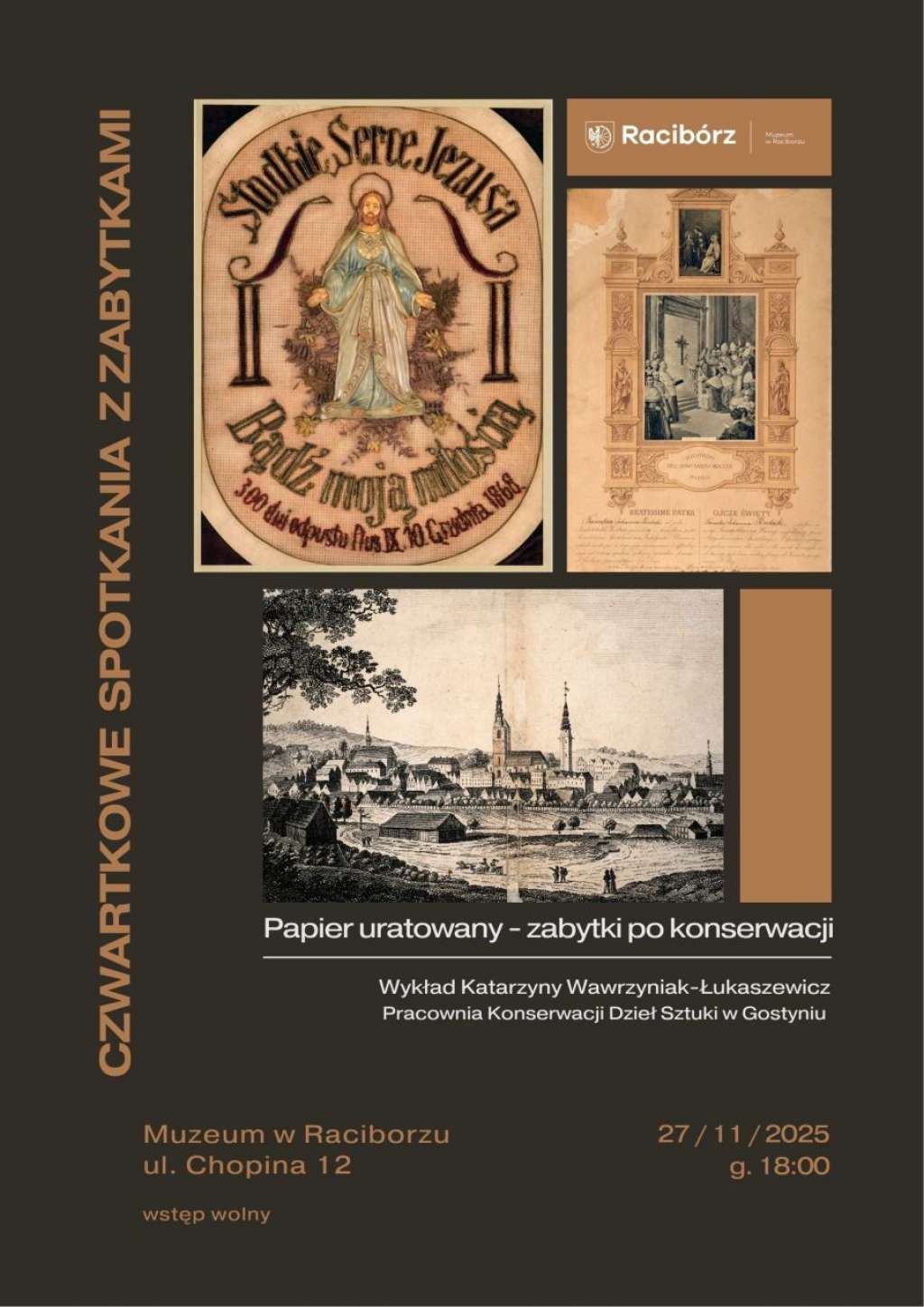 Głównym punktem programu będzie wykład zatytułowany „Papier uratowany – zabytki po konserwacji”, który poprowadzi Katarzyna Wawrzyniak-Łukaszewicz, doświadczona Konserwator Dzieł Sztuki z Pracowni Konserwacji Dzieł Sztuki w Gostyniu. Ekspertka, z którą Muzeum w Raciborzu od lat współpracuje, omówi kluczowe techniki i najlepsze praktyki związane z ochroną i renowacją cennych dokumentów, rękopisów, starodruków oraz innych obiektów papierowych o dużej wartości historycznej i artystycznej. W trakcie prezentacji przedstawione zostaną również przykłady zrealizowanych projektów na konkretnych zabytkach pochodzących ze zbiorów Muzeum w Raciborzu. Organizatorzy podkreślają, że wydarzenie stanowi niepowtarzalną okazję dla miłośników dziedzictwa kulturowego, studentów konserwacji oraz wszystkich zainteresowanych ochroną i renowacją zabytków papierowych.