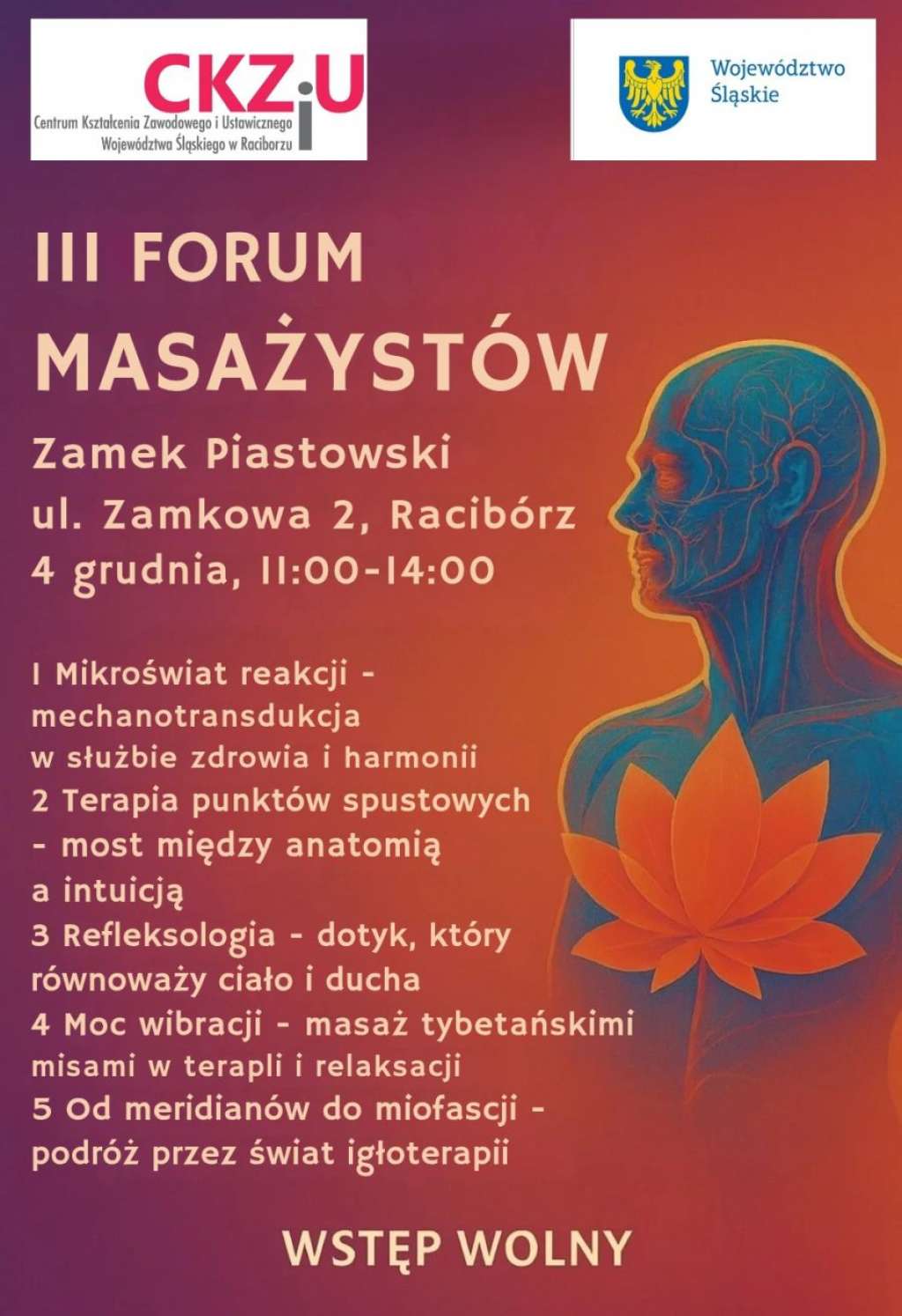 Centrum Kształcenia Zawodowego i Ustawicznego Województwa Śląskiego w Raciborzu zaprasza na III Forum Masażystów, które odbędzie się na Zamku Piastowskim 4 grudnia w godz. 11:00-14:00. Uczestnicy będą mieli okazję wysłuchać pięciu prelekcji. Pierwsza z nich dotyczy mikroświata reakcji – mechanotransdukcji w służbie zdrowia i harmonii. Następnie zostanie omówiona terapia punktów spustowych jako most między anatomią a intuicją. Kolejnym tematem będzie refleksologia – jako dotyk, który równoważy ciało i ducha. Forum poruszy także zagadnienie mocy wibracji, a konkretnie masażu tybetańskimi misami w terapii i relaksacji. Całość zamknie prelekcja o tytule "Od meridianów do miofasci – podróż przez świat igłoterapii".