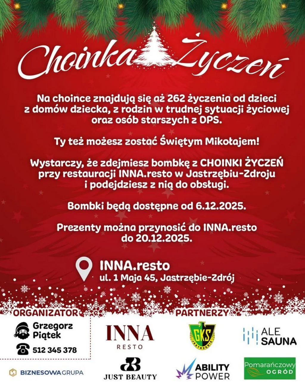 W razie dodatkowych pytań można je kierować bezpośrednio do organizatora – Grzegorza Piątka z Fundacji Biznesowa Grupa, tel. 512 345 378. Partnerami akcji są: INNA.resto, Pomarańczowy Ogród, GKS Jastrzębie, Ability Power Angelo Szefler, Just Beauty - Justyna Pawlińska, Ale sauna.