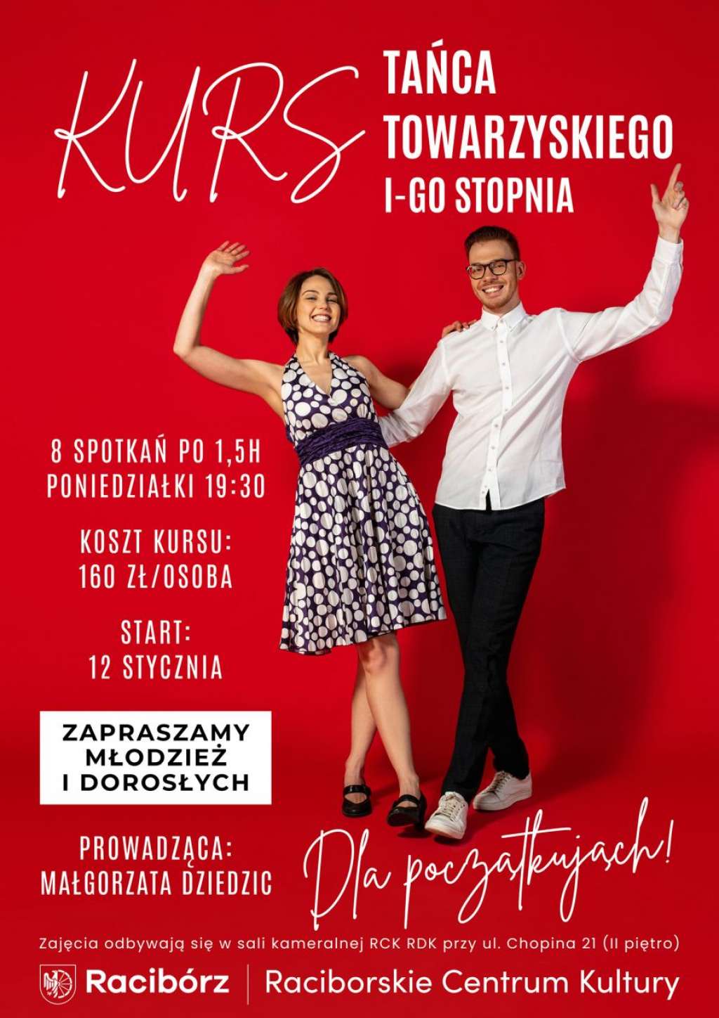 Raciborskie Centrum Kultury ogłosiło nabór na kurs tańca towarzyskiego pierwszego stopnia skierowany do osób początkujących. Pierwsze zajęcia zaplanowano na poniedziałek, 12 stycznia, o godz. 19:30. Inicjatywa ta jest dedykowana zarówno młodzieży, jak i dorosłym, którzy chcą poznać podstawowe kroki oraz figury taneczne przydatne podczas różnego rodzaju uroczystości i wydarzeń towarzyskich.
