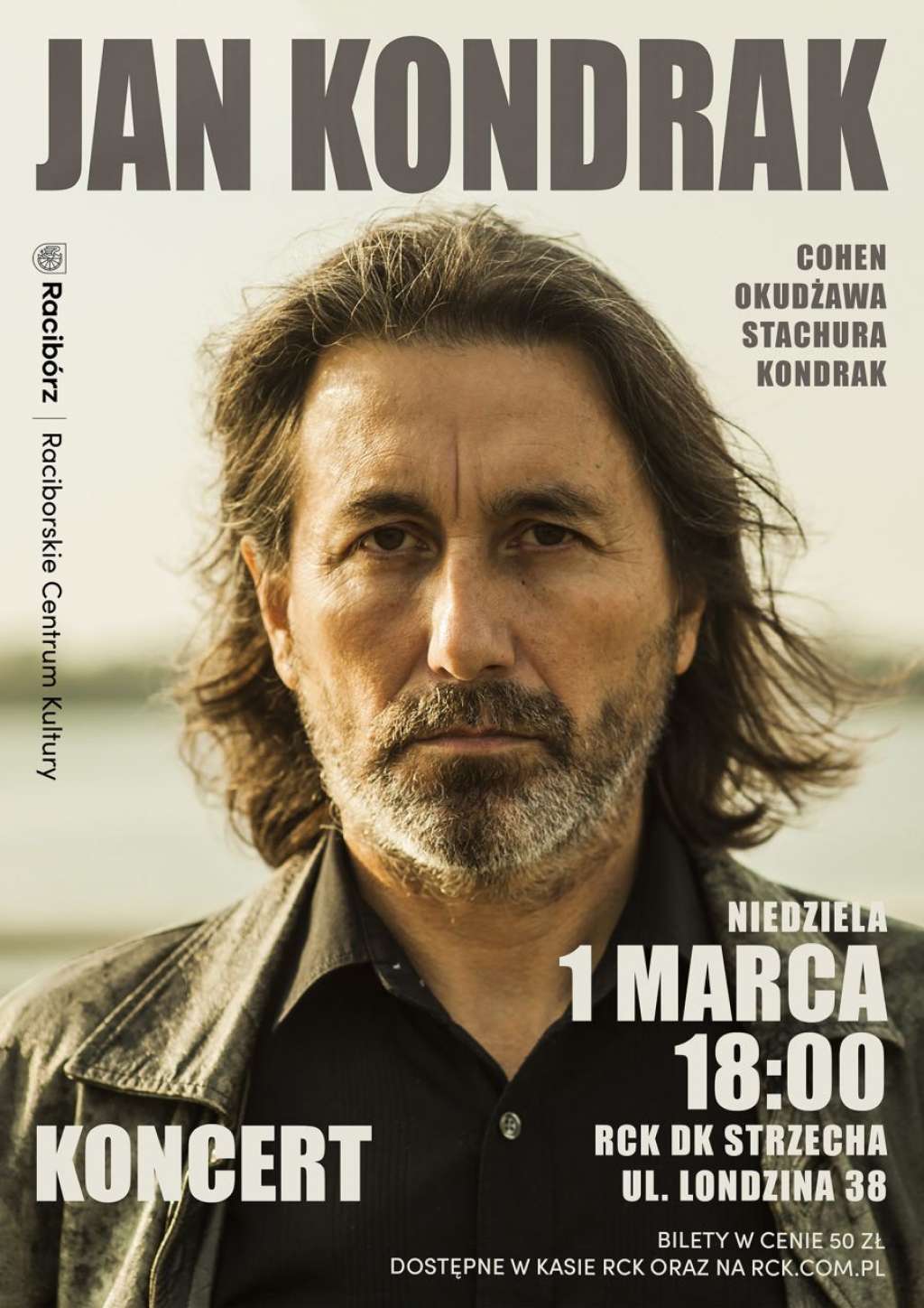 Raciborskie Centrum Kultury zaprasza na solowy koncert Jana Kondraka, który odbędzie się 1 marca o godz. 18:00 w Domu Kultury Strzecha. Artysta jest znany lokalnej publiczności zarówno z wcześniejszych występów solowych i koncertów z Lubelską Federacją Bardów, jak i z prowadzenia warsztatów twórczych dla młodzieży. Podczas nadchodzącego wydarzenia zaprezentuje klasykę piosenki autorskiej, w tym utwory takich mistrzów jak Leonard Cohen, Bułat Okudżawa czy Edward Stachura, a także autorskie kompozycje z własnego, wieloletniego dorobku.