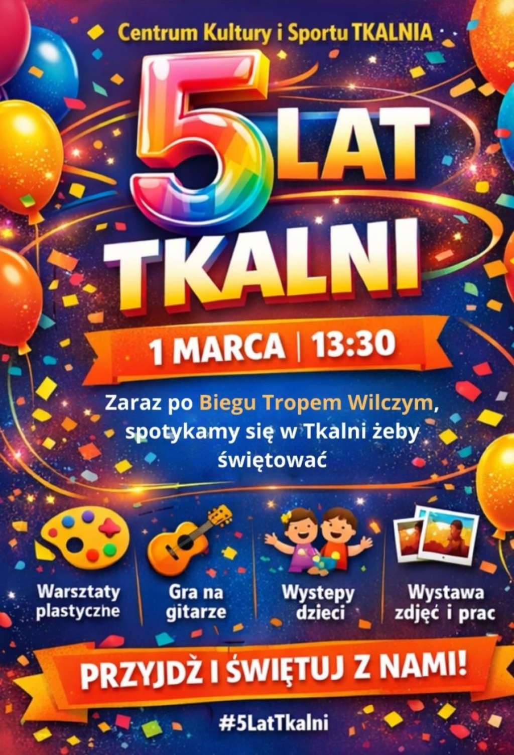 1 marca odbędą się obchody jubileuszu pięciolecia działalności Centrum Kultury i Sportu Tkalnia w Kietrzu. Wydarzenie rozpocznie się o godz. 13:30, bezpośrednio po zakończeniu Biegu Tropem Wilczym. Program jubileuszu przewiduje liczne atrakcje o charakterze artystycznym i rekreacyjnym, w tym występy dzieci, muzykę na żywo na gitarze oraz wystawę fotografii i prac plastycznych. Uczestnicy będą mogli wziąć też udział w warsztatach kreatywnych oraz rodzinnych rozgrywkach w darta i bilarda, a zwieńczeniem wspólnego świętowania będzie urodzinowy poczęstunek w formie tortu.