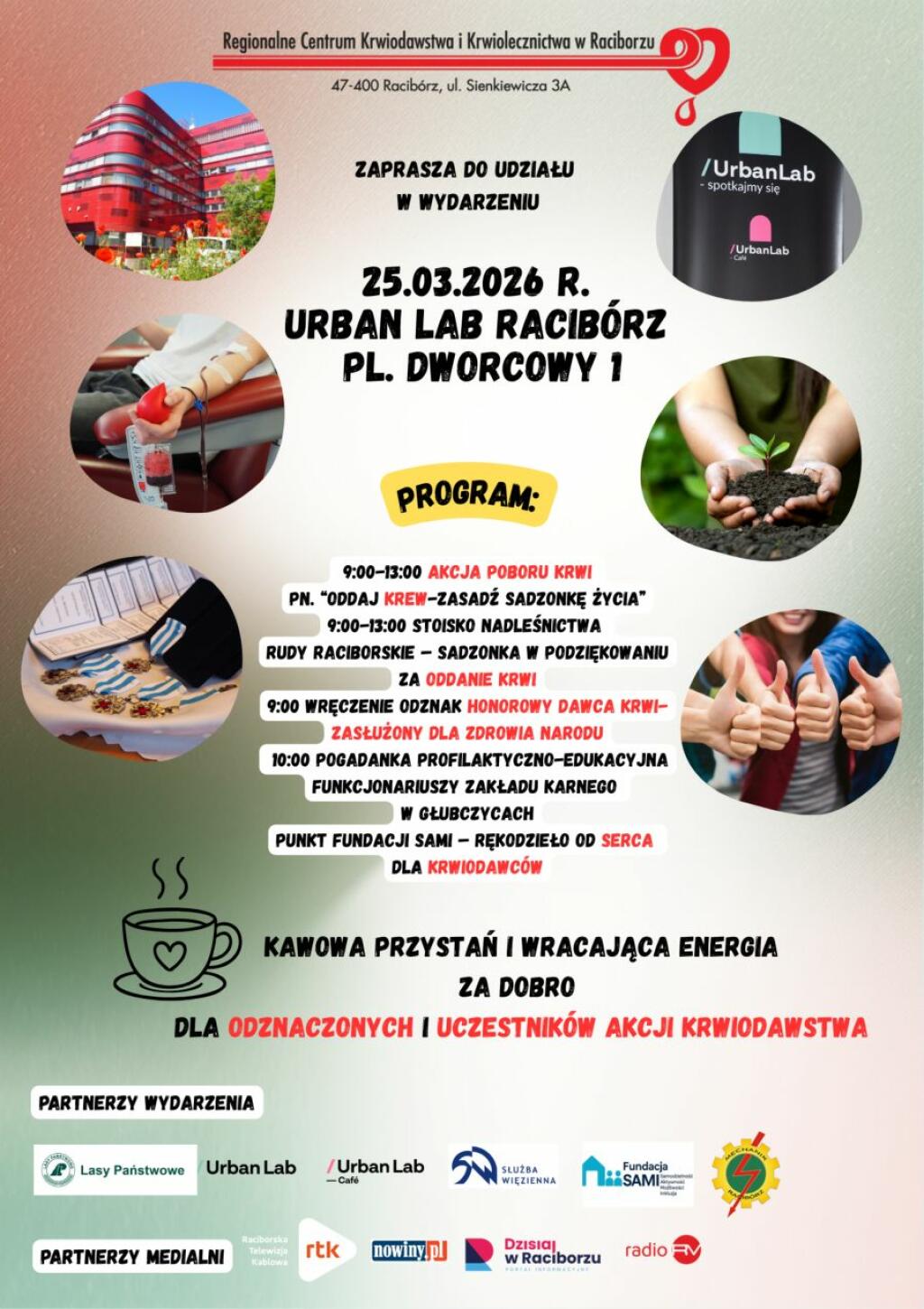 Regionalne Centrum Krwiodawstwa i Krwiolecznictwa w Raciborzu zaprasza do udziału w wydarzeniu pod hasłem „Oddaj krew – zasadź sadzonkę życia”, które odbędzie się 25 marca w przestrzeni Urban Labu Racibórz przy Pl. Dworcowym 1. Inicjatywa ta łączy ideę krwiodawstwa z edukacją i ekologią. Głównym punktem będzie akcja poboru krwi prowadzona od godz. 9:00 do 13:00, podczas której każda osoba dzieląca się tym cennym lekiem otrzyma w podziękowaniu sadzonkę drzewa przygotowaną przez Nadleśnictwo Rudy Raciborskie.