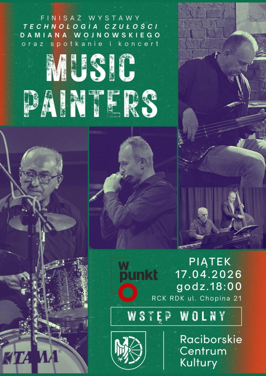 W piątek 17 kwietnia o godz. 18:00 w Raciborskim Centrum Kultury przy ul. Chopina 21 odbędzie się finisaż wystawy Damiana Wojnowskiego pt. „Technologia Czułości”. Wydarzenie, organizowane w ramach cyklu „W punkt”, stanowi zakończenie ekspozycji prezentowanej w Galerii I Piętra i będzie okazją do bezpośredniej rozmowy z artystą na temat jego malarskich inspiracji oraz procesów twórczych. Wieczór dopełni recital jazzowy zespołu Music Painters, w którego składzie występuje sam autor wystawy. Grupa zaoferuje uczestnikom nastrojową podróż dźwiękową opartą na poetyckiej łagodności i dbałości o muzyczną kolorystykę. Formacja zaprezentuje się w kwartecie z Andrzejem Taraszkiewiczem na pianinie, Krzysztofem Kijasem grającym na harmonijce ustnej, Mirosławem Bernasiukiem na instrumentach perkusyjnych i Damianem Wojnowskim na gitarze basowej.