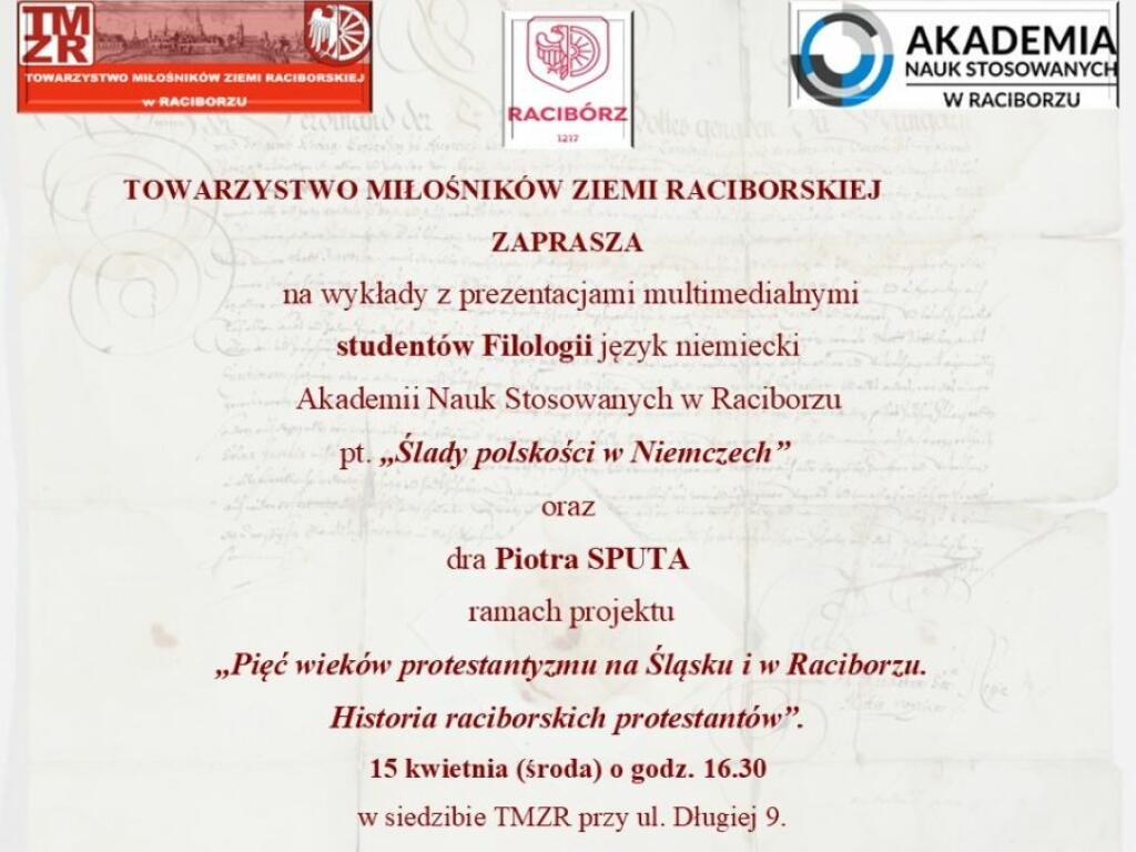 Towarzystwo Miłośników Ziemi Raciborskiej zaprasza na wykłady, które odbędą się w środę 15 kwietnia o godz. 16:30. Spotkanie zaplanowano w siedzibie TMZR przy ul. Długiej 9 w Raciborzu. W programie przewidziano wystąpienia studentów filologii języka niemieckiego Akademii Nauk Stosowanych w Raciborzu pt. „Ślady polskości w Niemczech” oraz prelekcję dr. Piotra Sputa w ramach projektu „Pięć wieków protestantyzmu na Śląsku i w Raciborzu. Historia raciborskich protestantów”.